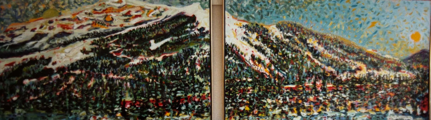 This two-panel painting is another in the Vanishing Canadian train series. The --- representation of this piece is the artist’s intentional ploy to indicate the fracturing-of eaiser access to areas of our vast Canadian country caused by the removal of a great portion of ViaRail’s route through western Canada.